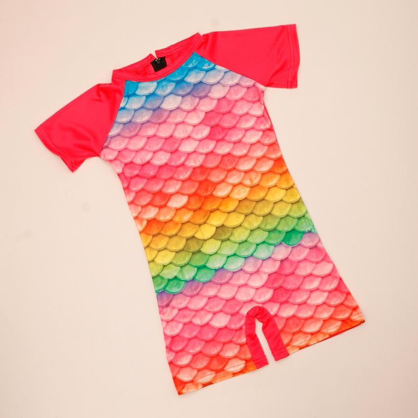 Designed with vibrant rainbow hues and a fun scale pattern, this swimsuit brings cheerful energy to every splash. The soft, stretchy fabric and short-sleeve design keep your little swimmer comfy and protected for endless summer fun! ☀️💦