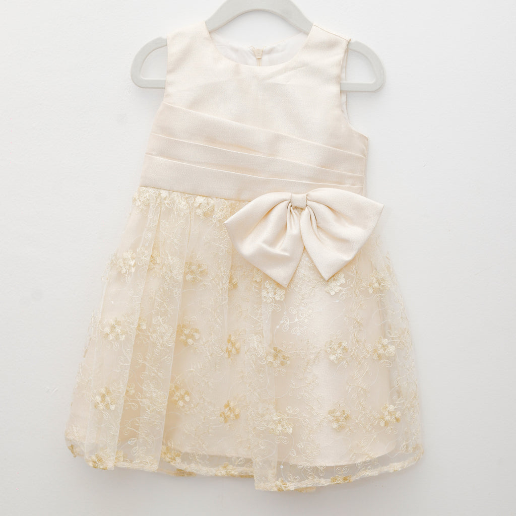 Girls Sleeveless Bow Embroidered Tulle Party Dress in Dull Gold