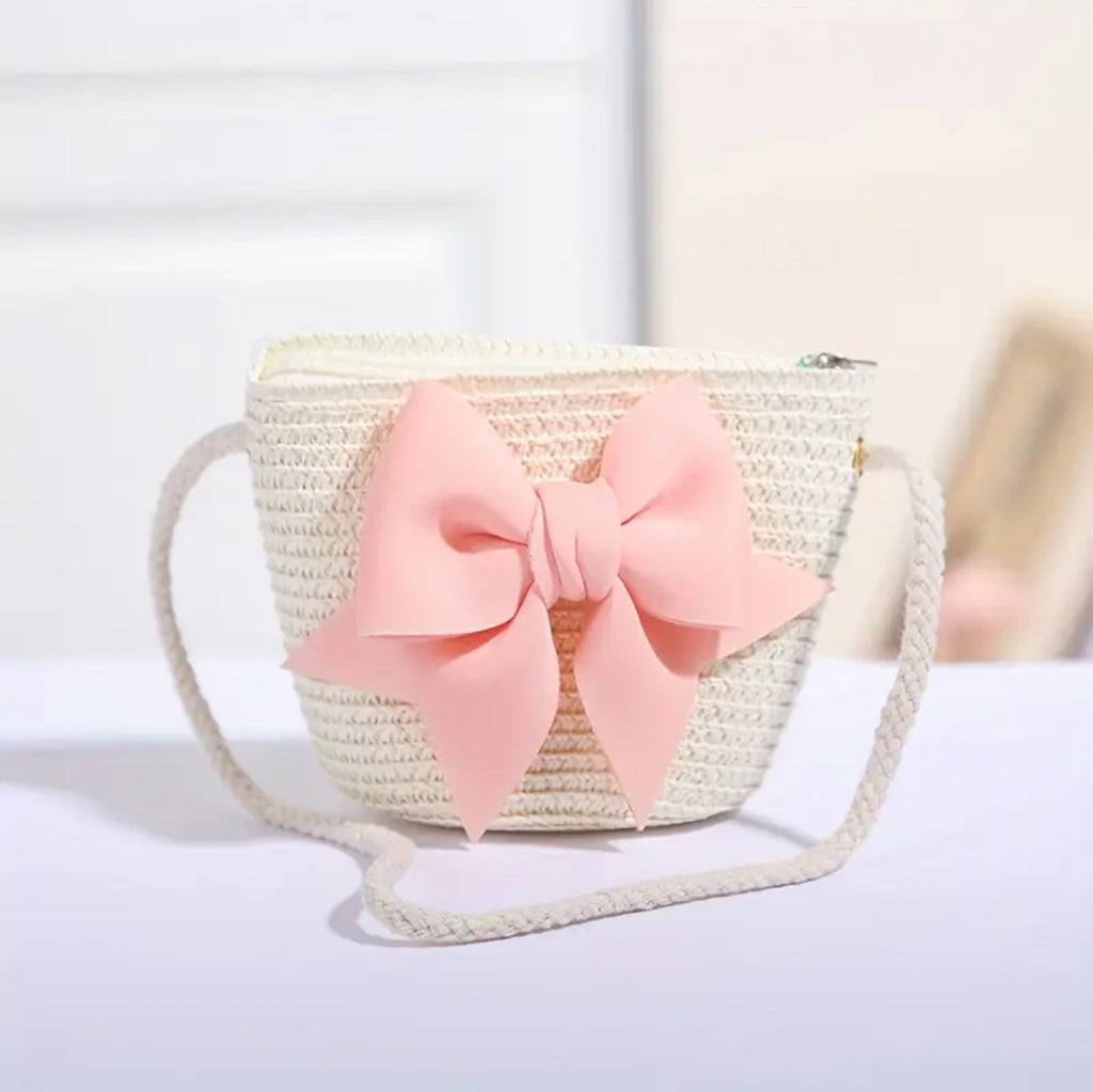 This handmade straw purse with a beautiful bow design is the perfect accessory for any little girl. Its neutral off-white and peach colors make it versatile and stylish.