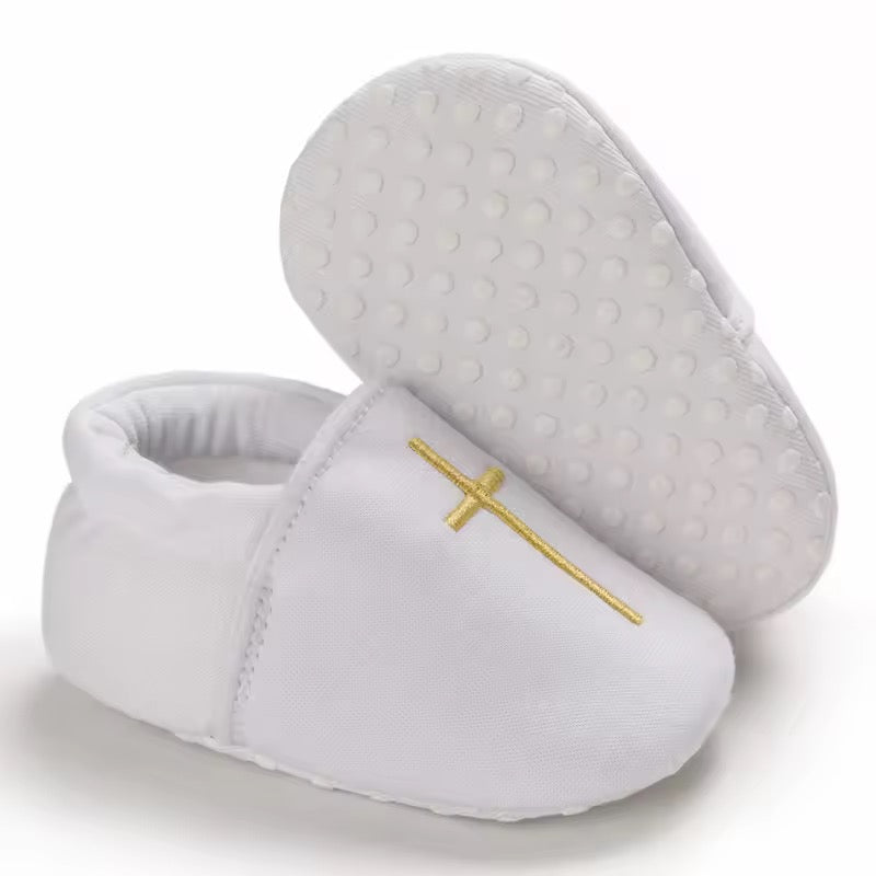Infant Baby Christening Shoes - White With Yellow Cross Embroidery Detail