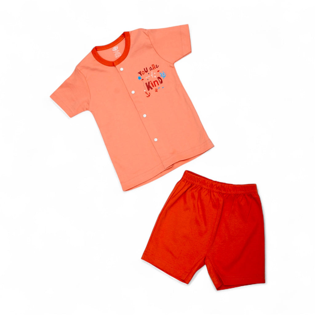 Celebrate your little one with this bright and cheerful Infant Cotton 'You Are Kind’ Print T-Shirt and Shorts Set. Designed for superior comfort and mobility, this two-piece outfit is made entirely from soft, breathable cotton, making it perfect for summer days or year-round play. The vibrant peach-colored T-shirt features a sweet "You are my Kind" graphic paired with coordinating solid red shorts that have a gentle elastic waistband, this set offers a pop of color and a cozy fit for all your baby's daily adventures.