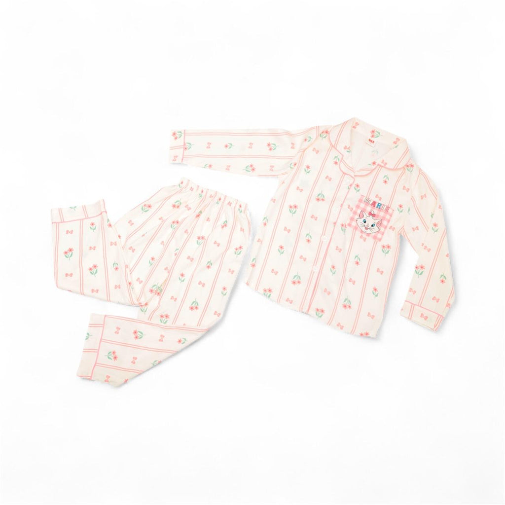 Drift off to sweet dreams in the enchanting Marie Bows and Flowers Pajama Set. This timeless ensemble features a soft, breathable cotton fabric patterned with delicate floral sprigs and dainty pink bows. The top boasts a classic button-up design with a collar and is accented by an adorable kitten patch on the chest pocket. Combining classic sleepwear styling with a whimsical print, this set ensures maximum comfort and a charming, cozy look for restful nights and relaxed mornings.