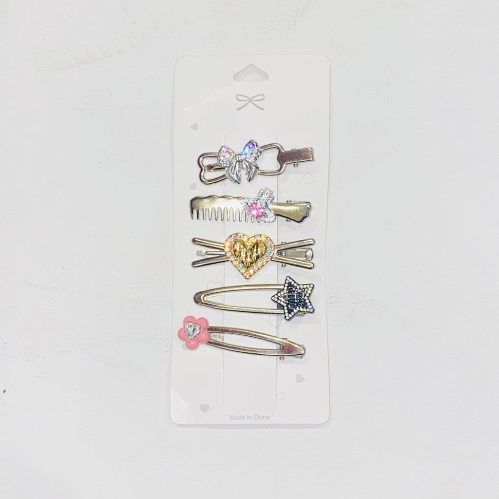 This Metal 5 piece hairclip set offers sleek, durable clips perfect for everyday styling. Crafted from sturdy metal, they provide a secure hold while adding a minimalist touch to your look. Ideal for all hair types.