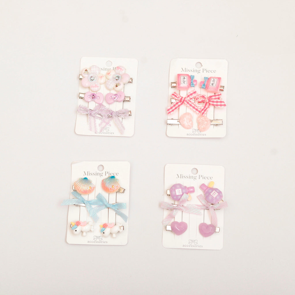 Elevate any look with the Novelty Charm Hair Clips, an assortment of whimsical hair accessories that bring a playful, youthful charm. Each card features a unique set of three individual snap barrettes, embellished with a delightful mix of popular charms like seashells, hearts, bows, and sweet florals. Perfect for adding a fun, personalized accent to pigtails, braids, or side-swept hair, this collection offers variety and secure hold for any occasion.