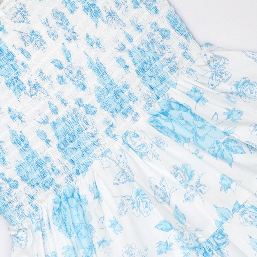 Crafted from soft cotton, this smocked dress showcases a refined blue and white floral print that enhances its classic appeal. The smocking detail provides a tailored yet flexible fit, while the breathable fabric ensures comfort in warm weather. Perfect for sophisticated daywear, it combines elegance and ease for a versatile wardrobe staple.