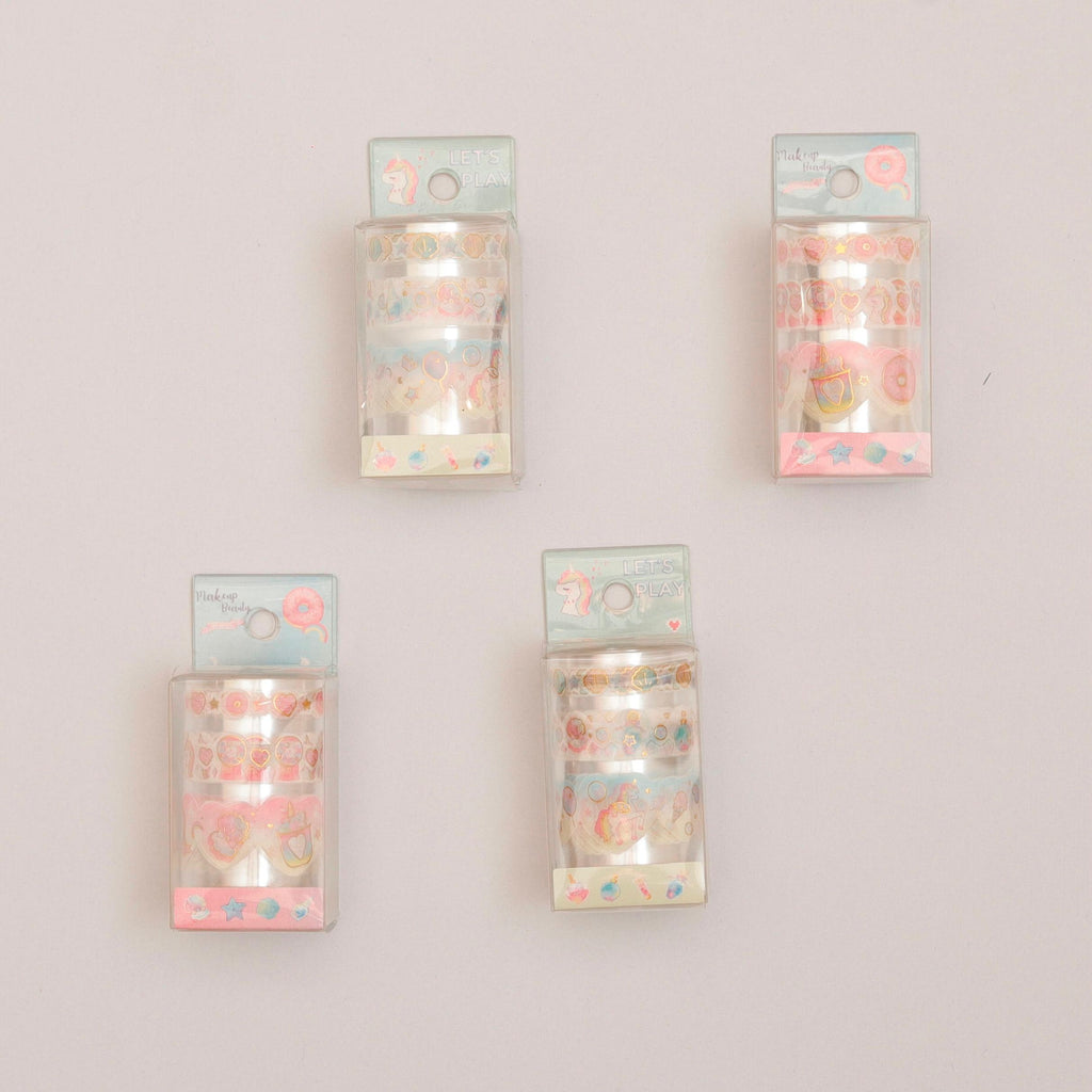 Unleash your creativity with the Sweet Treat Decorative Washi Tape Box. This charming set features rolls of adhesive tape with kawaii-inspired patterns including playful unicorns, delectable donuts, sparkling hearts, and colorful stars. Perfect for scrapbooking, journaling, gift wrapping, or adding a whimsical touch to any craft project, this washi tape offers easy application and reliable adhesion. It's an essential addition for anyone looking to organize, decorate, and personalize their space with a pop of pastel charm.