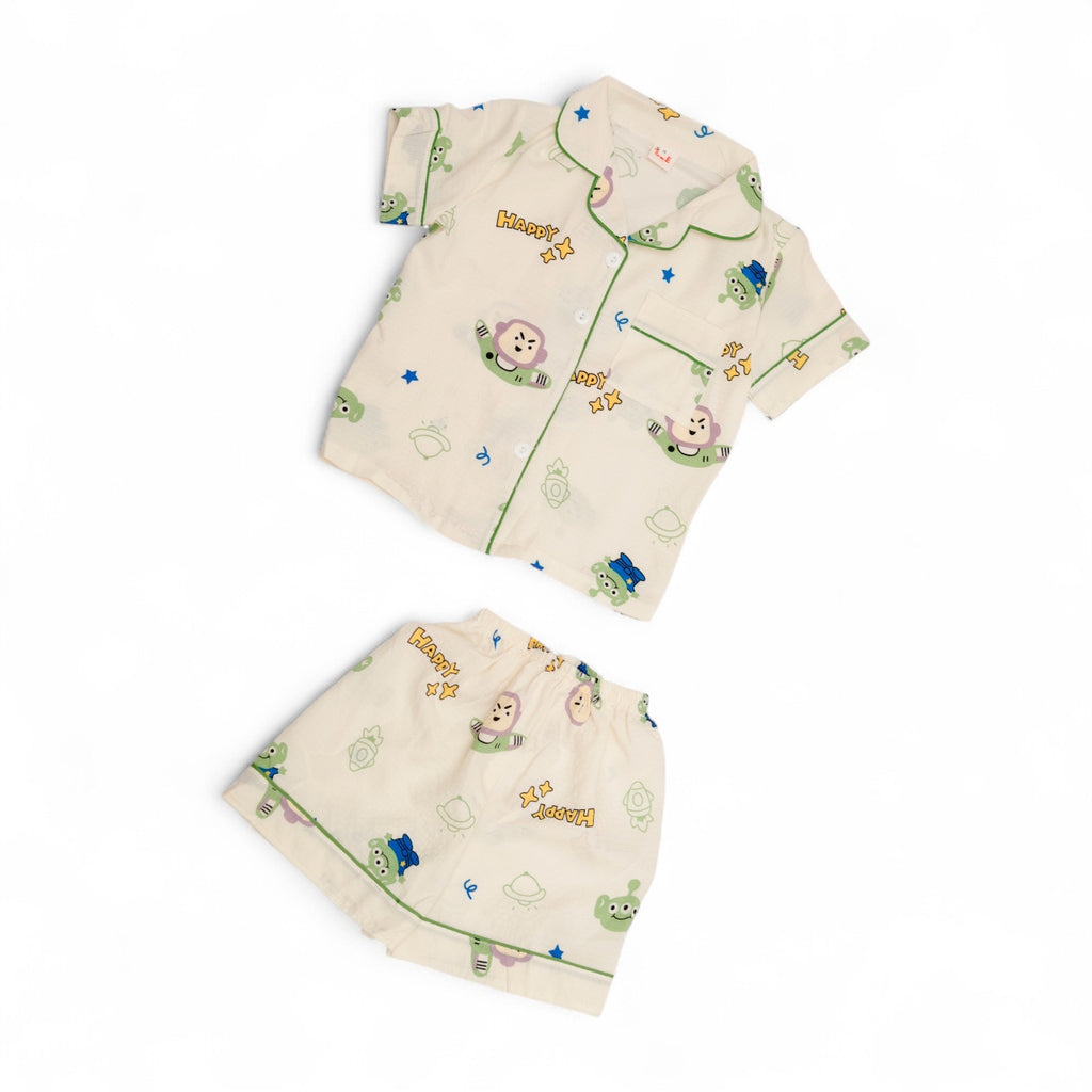 Get ready for bed with the iconic Little Green Men and Buzz Lightyear in this charming Toy Story Space Pajama Set! Inspired by the aliens' favorite spot, this short-sleeve and shorts set features an all-over print of the beloved Toy Story Spacemen. The classic camp collar and contrasting green piping offer a timeless, tailored look, while the soft, breathable material ensures a cool and cozy night's sleep. It's the perfect uniform for any little astronaut who dreams of visiting Space!